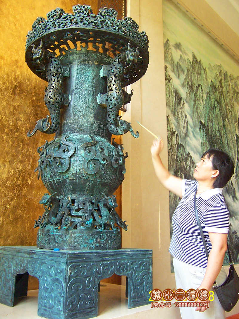 青銅尊造型端莊優(yōu)美,紋飾精巧、復(fù)雜,是現(xiàn)已出土的青銅器中最復(fù)雜、精美的珍品。尊高2.13米,敞口寬1米。尊是盛酒器,內(nèi)盛摻有香草汁的酒,祭祀時酌以敬獻神靈,賓禮時酌以飲客。青銅尊安裝 到湖北省接待重要貴賓的地方——武漢東湖賓館會議廳,同時訂購的還有青銅筒形器等,這些器物擺放 在中式裝修風(fēng)格的建筑中起到了畫龍點睛的作用,將它們擺放在會議廳,代表湖北燦爛的歷史文化。
