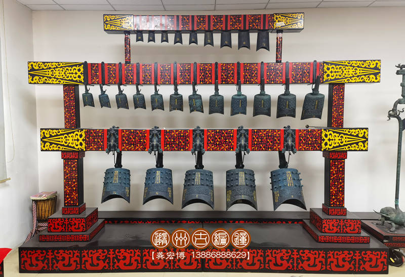 簡(jiǎn)介:26件木結(jié)構(gòu)演奏級(jí)編鐘,是一套專(zhuān)業(yè)演奏類(lèi)古樂(lè)器,整套編鐘分3層懸掛排列,由長(zhǎng)短不同的三根彩繪橫梁和4個(gè)青銅佩劍武士立柱及2根圓立柱組成